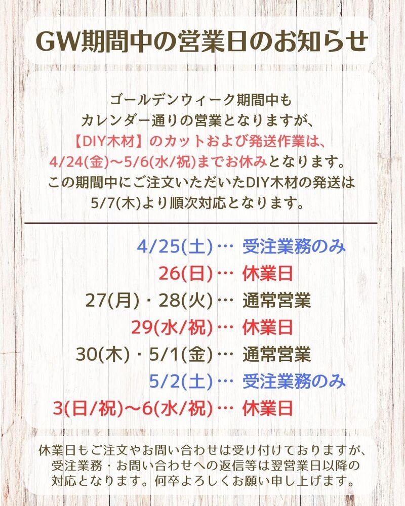 『Morock Village GW営業日のお知らせ』 2026.04.23 Morock Village 誠に勝手ながら、GW期間中はカレンダー通りの営業となります。『DIY木材』はさらに長いお休みをいただきますので、どうぞ宜しくお願いいたします。 PDFを開く